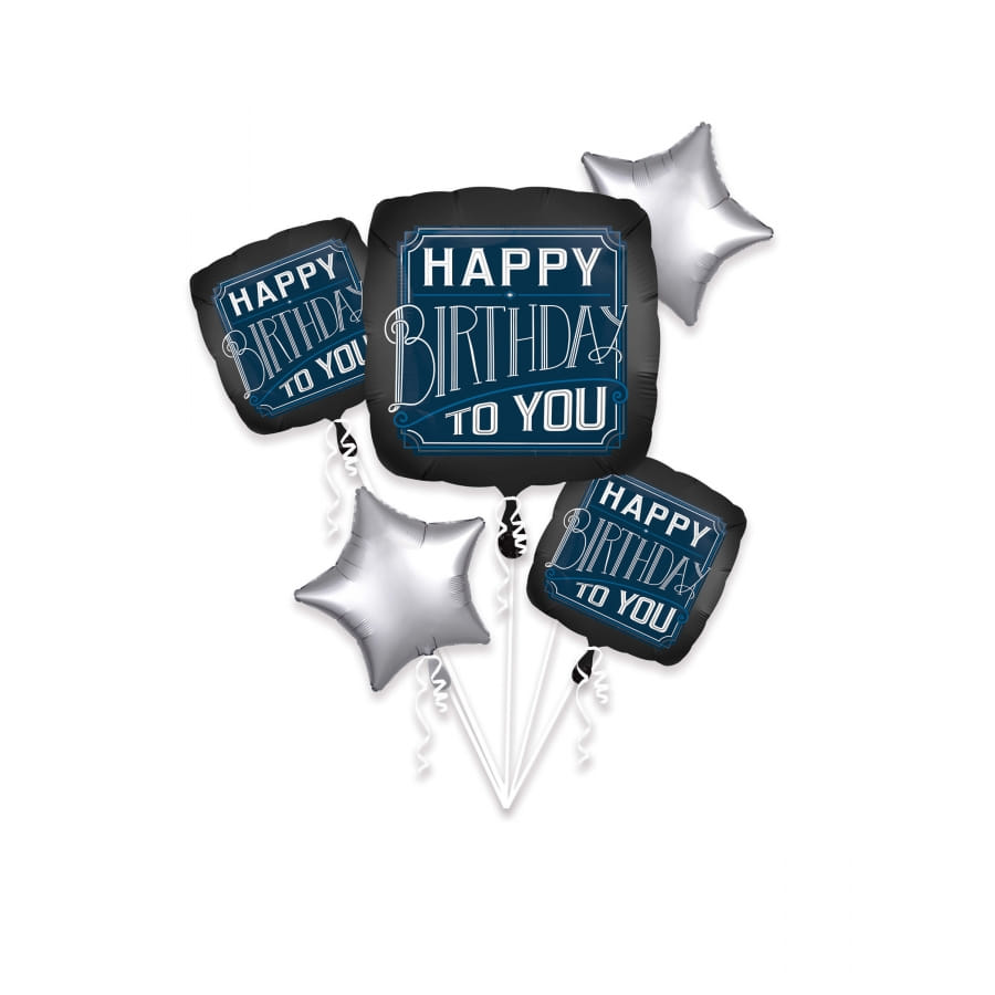 Il est question d'un lot de 5 ballons d'anniversaire. Ce lot est composé de 3 ballons noirs de forme carrée (2 ballons de 43 cm et 1 ballon de 71 cm), et 2 ballons gris argent en forme d'étoile mesurant chacun 43 cm. Les ballons carrés sont chacun imprimés de l'expression "Happy Birthday to you".