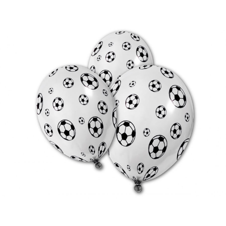 Il s'agit de ballons gonflables en latex, décorés de ballons de foot de tailles variées, imprimés sur un fond blanc.
