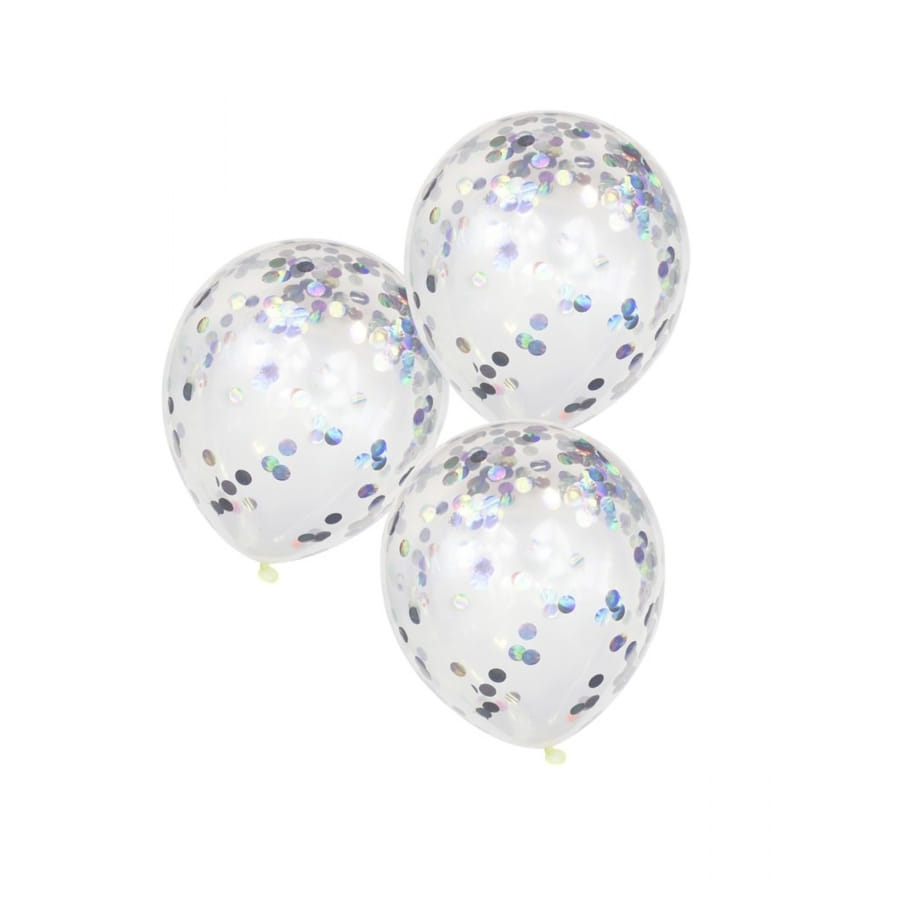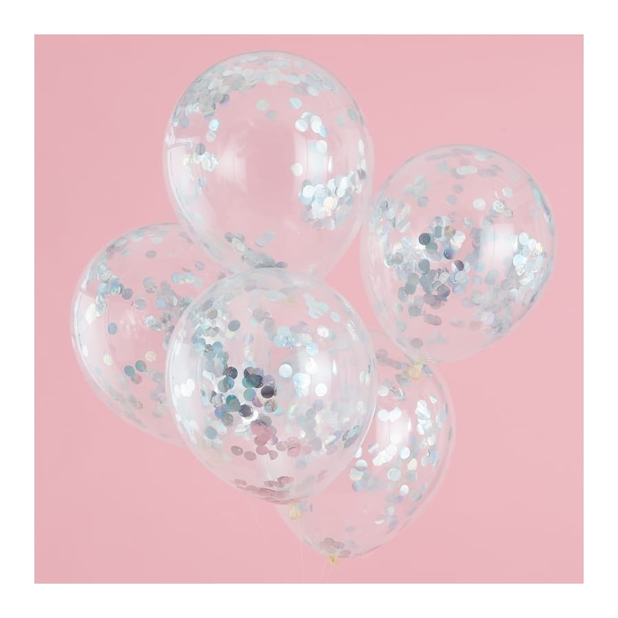 Ajoutez une touche brillante à votre décoration d'anniversaire, grâce à ces 5 ballons transparents avec confettis irisés.