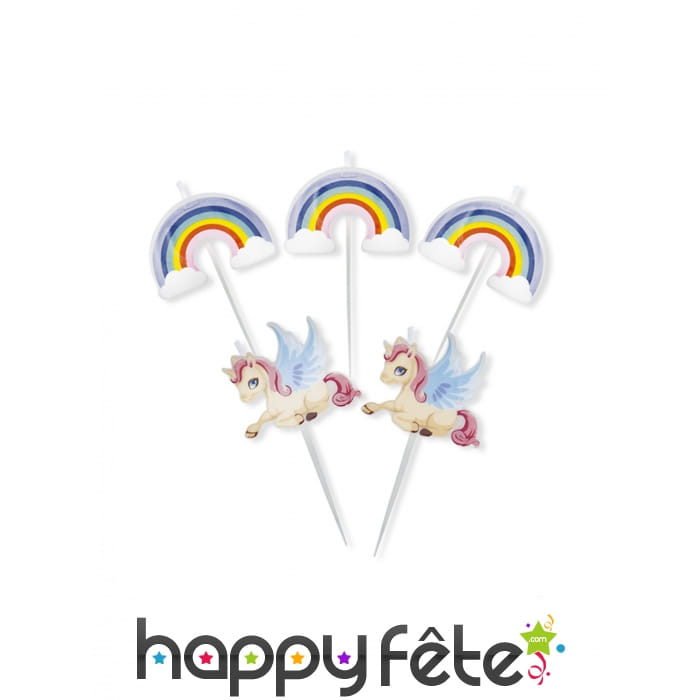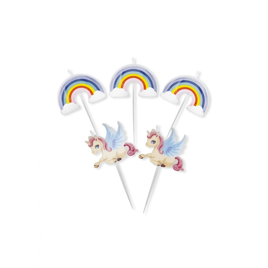 Transférez votre enfant dans un monde féerique, en décorant son gâteau d'anniversaire de ces 5 bougies licornes et arc-en-ciel sur tige, 8 cm.