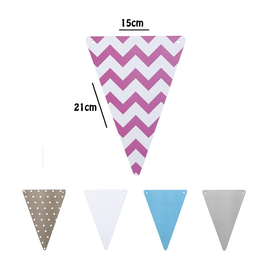 Les 5 fanions en carton DIY mesurent chacun 15 x 21 cm.