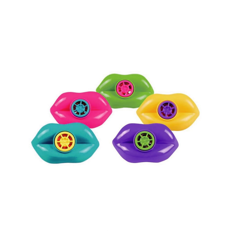 Les 5 sifflets en forme de bouche mesurant 7 cm sont en plastique.