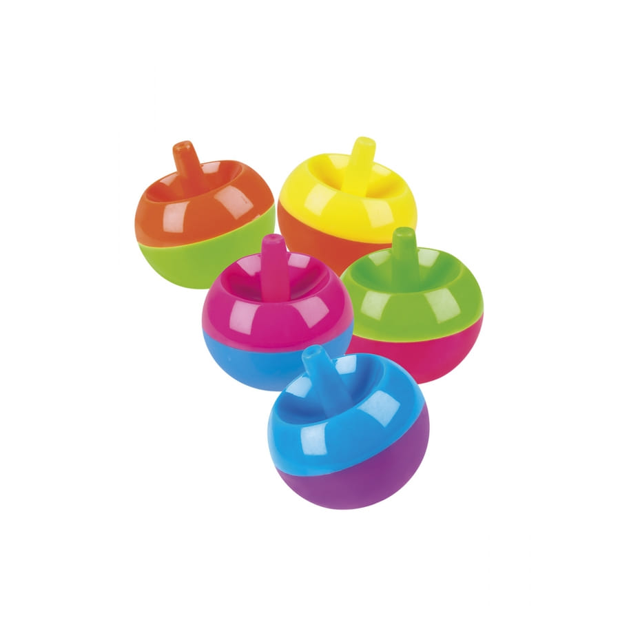 Les 5 toupies multicolores de 3,5 cm sont en plastique.
