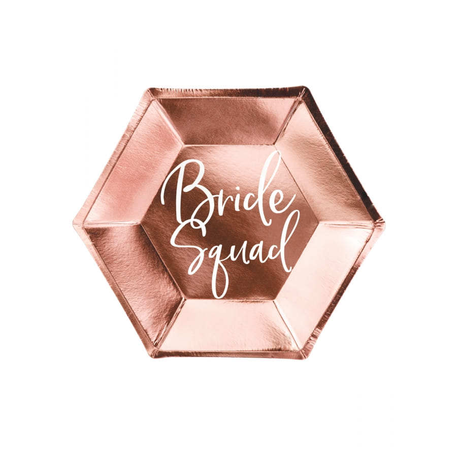 Optez pour une vaisselle aussi originale que le sera votre soirée d'enterrement de vie de garçon ou de jeune fille, avec les 6 assiettes Bride Squad rose dorée de 23 cm.