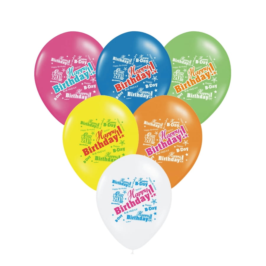 Ces ballons sont décorés des expressions Happy Birthday et B-Day en lettres colorées.