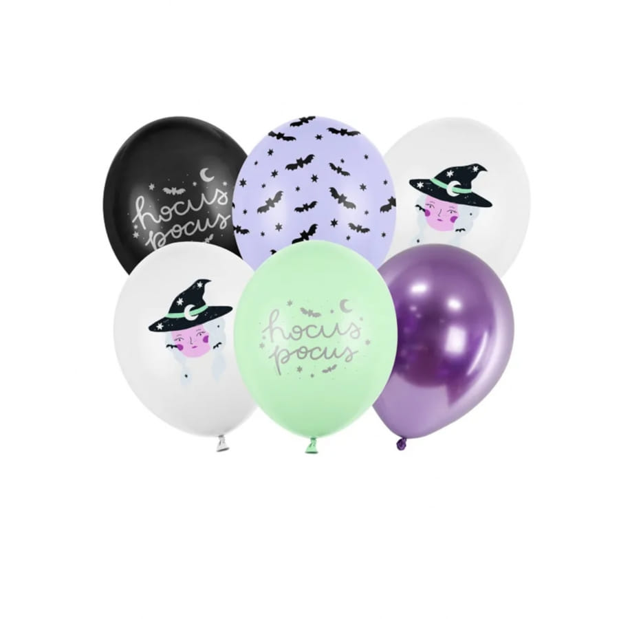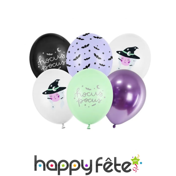 Sur les 6 ballons, 2 portent une tête de sorcière avec son chapeau, 2 autres (l'un noir et l'autre vert) sont marqués de l'inscription hocus pocus, un des ballons est violet métallisé et le dernier est décoré de chauves-souris noires sur un fond violet clair.