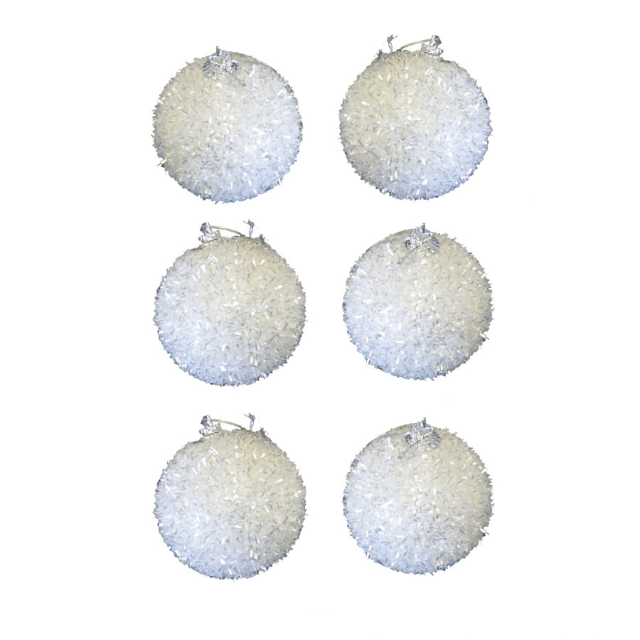 Ces boules de Noël sont toutes jolies et tellement douces au toucher. Elles sont à suspendre sur un sapin ou à déposer sur une table en guise de décorations de table. Ces boules ouatées, de couleur blanche irisée, ont été parées de paillettes pour leur donner plus de style et faire scintiller l'endroit où vous les disposerez. Un lot contient 6 boules de 6 cm de diamètre chacune.