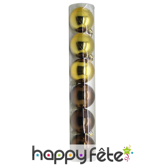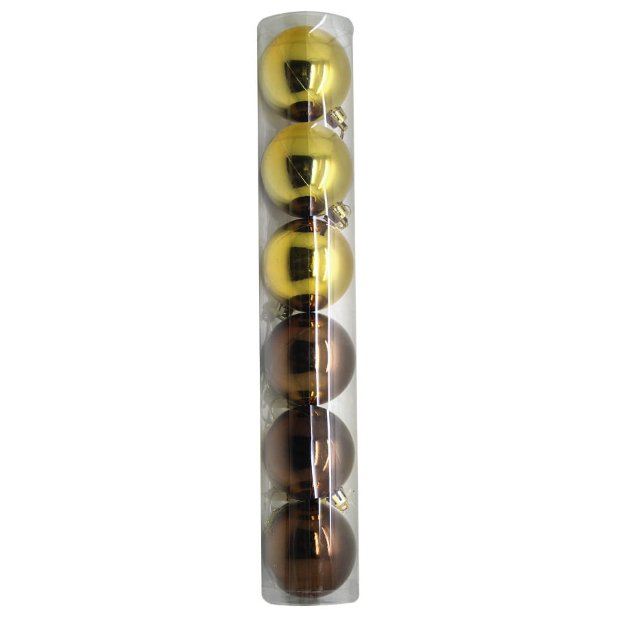 Optez pour ce lot de décoration de Noël pratique pour une décoration assortie et glamour. La boîte contient 6 boules, dont 3 de couleur dorée et 3 de couleur marron. Les boules, toutes en plastique brillant, mesurent 6 centimètres de diamètre chacune.