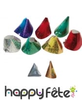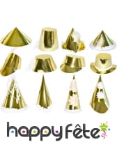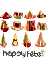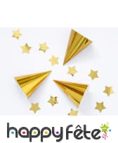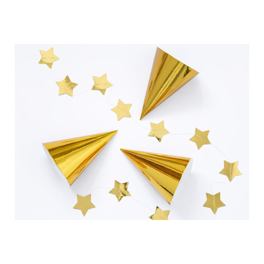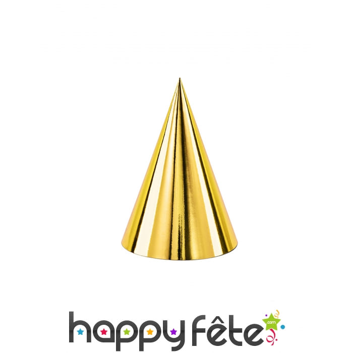 Vendu par 6, il s'agit d'un chapeau en carton doré, pointu et mesurant 16 centimètres de hauteur.