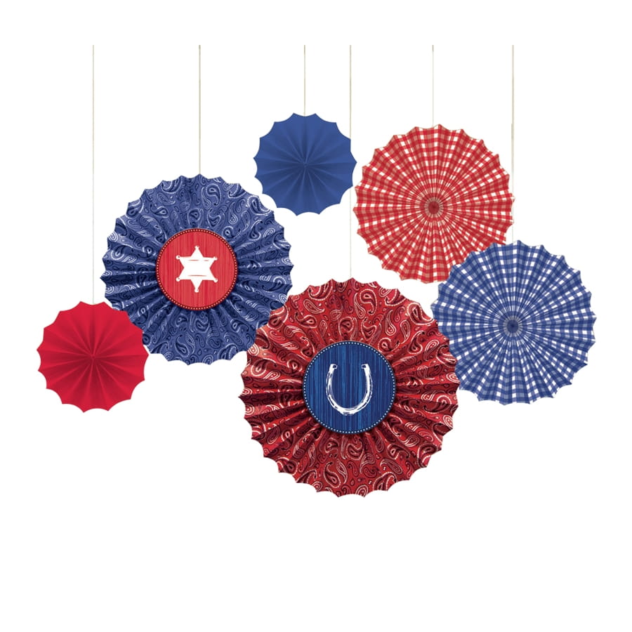 L'environnement western peut tout à fait être recréé chez soi ou à l'occasion d'un événement. L'assortiment de 6 éventails imprimés western est prévu pour cela. Il est composé de modèles rouges et bleus, à motifs westerns, et fabriqués en papier. Les tailles sont variables, allant de 30,4 cm à 40,6 cm de dimension.