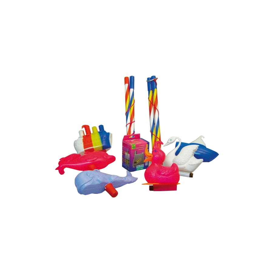 Set de pêche composé de 6 gros sujets flotters, de 2 cannes à pêche en plastique et d'un moteur pour faire tourner l'eau. Les flotteurs mesurent entre 15 et 25 centimètres. Vous pouvez vous en servir pour organiser un simple mais amusant jeu de pêche pour vos enfants.