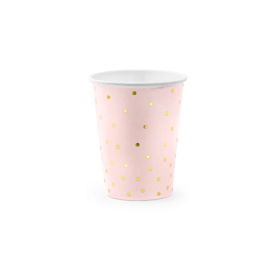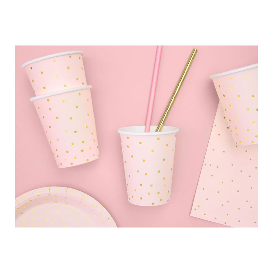 De la douceur, du chic et un soupçon de luxe sont les atouts phares du lot de 6 gobelets rose pois dorés, en carton.