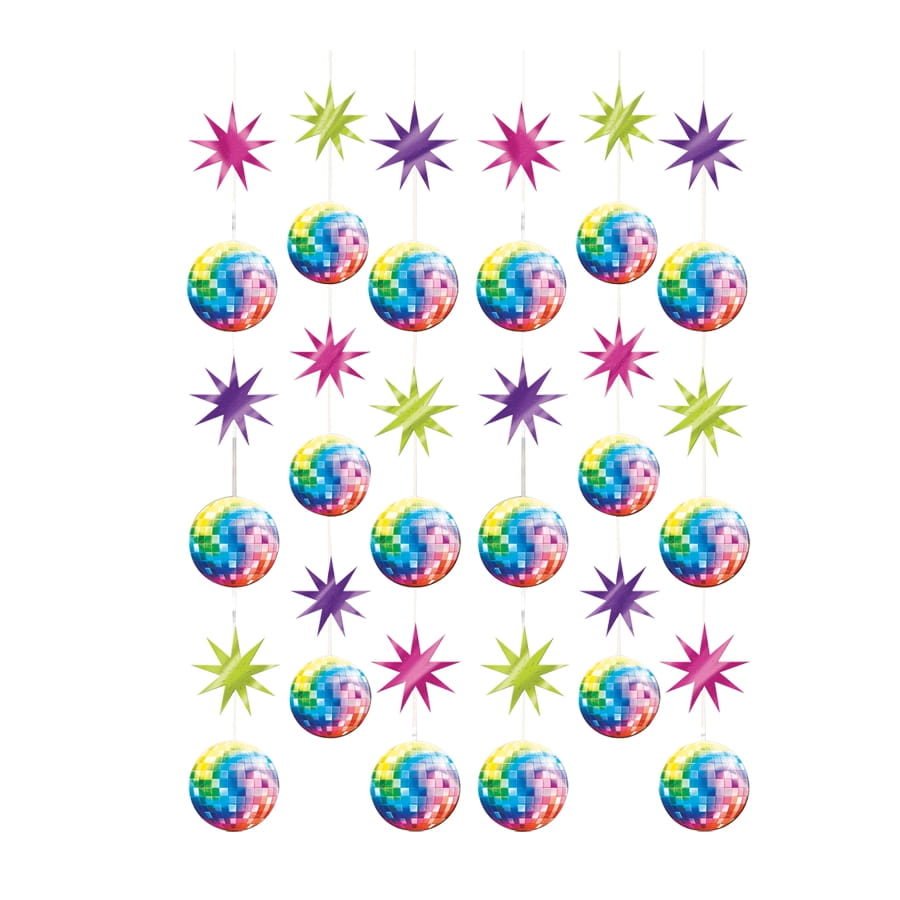 Vos talents de décorateur seront toujours mis à l'épreuve. Subtilisez ce lot de 6 guirlandes disco à suspendre pour apporter une ambiance années 70-80. Cet article est constitué par six accessoires de décoration au top. Multicolores, d'une longueur de 2,1 m, ces guirlandes sauront vous prouver leur efficacité. Des boules disco et des étoiles viendront s'accrocher un peu partout !