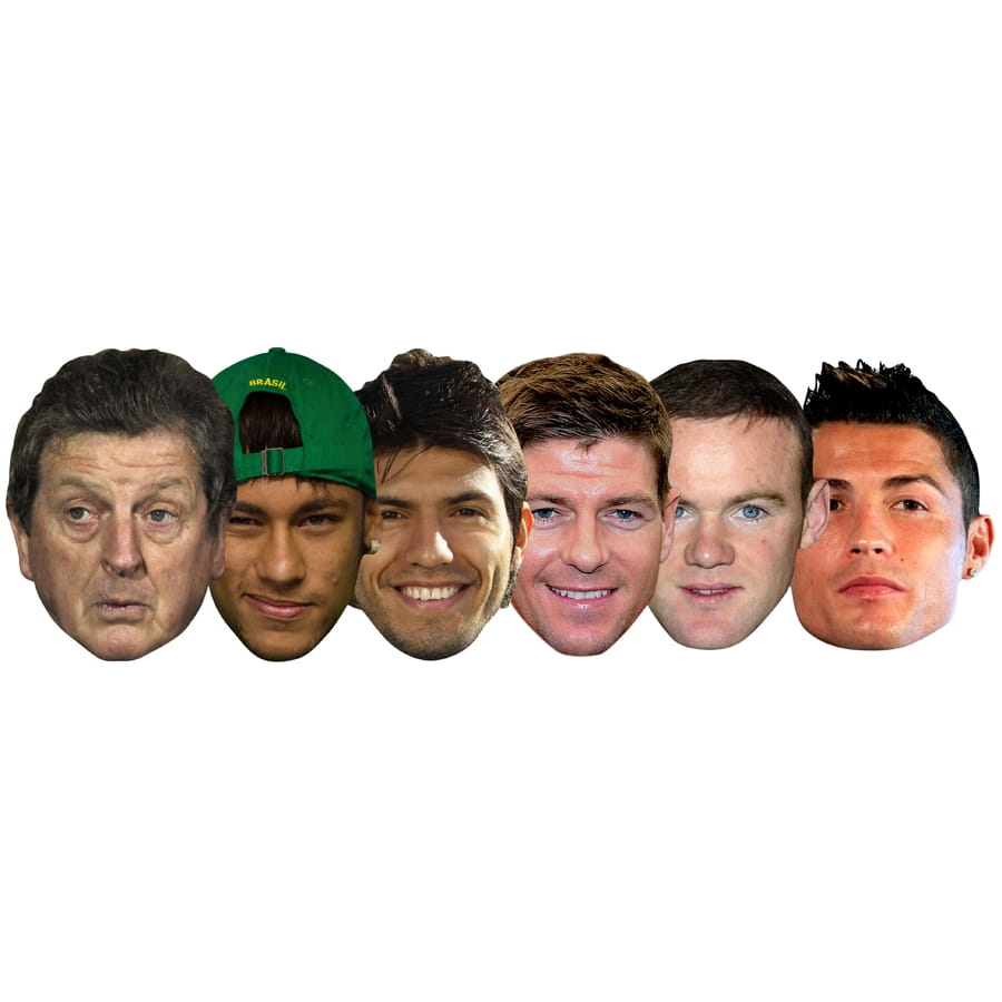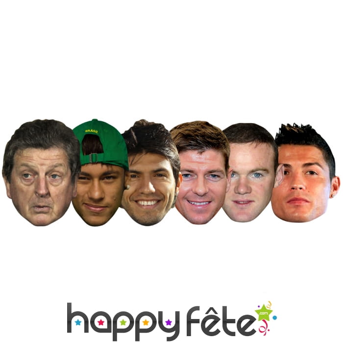 Si vous aimez l'univers du football, nous vous proposons ce lot de 6 masques à l'effigie de Hodgson, Rooney, Gerrard, Neymar, Aguero et Ronaldo. Ces masques sont destinés aux hommes, faits en carton plat de 23.5 cm x 30 cm et de couleur beige. Ceux-ci sont faciaux et recouvrent l'avant du visage.
