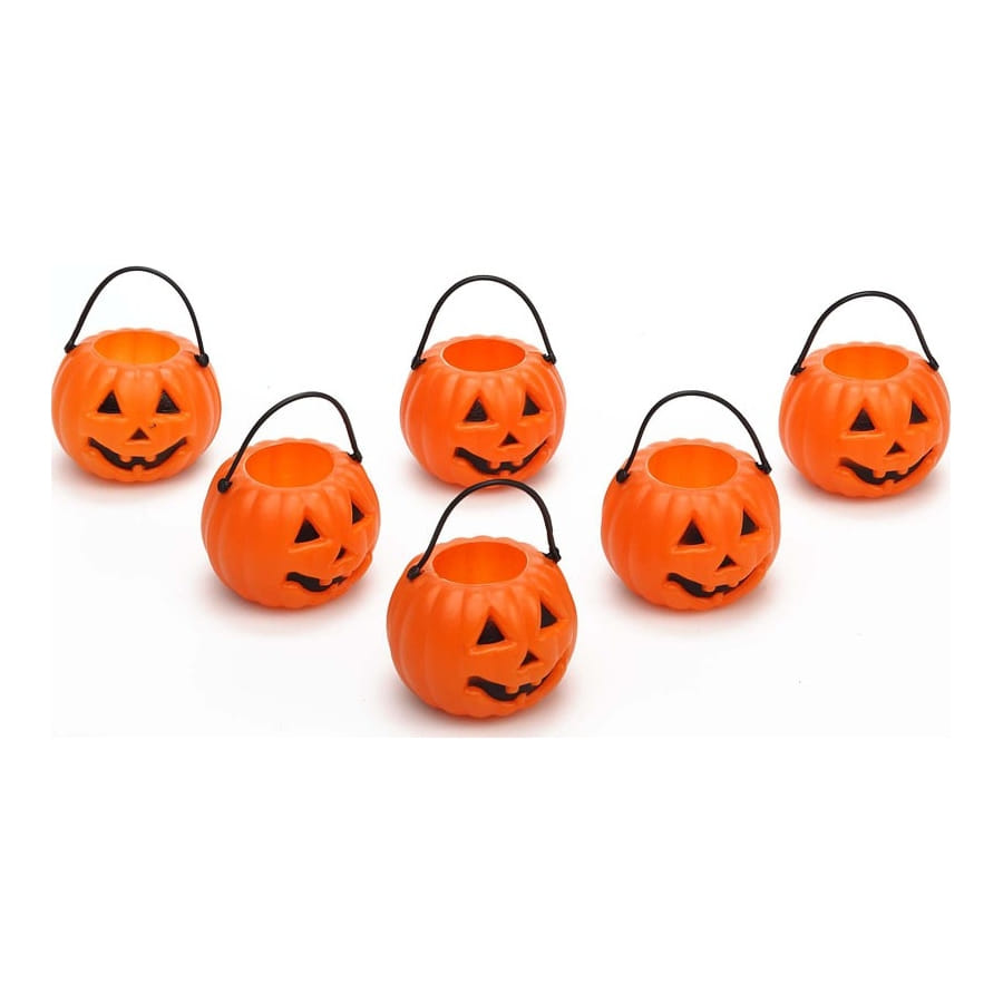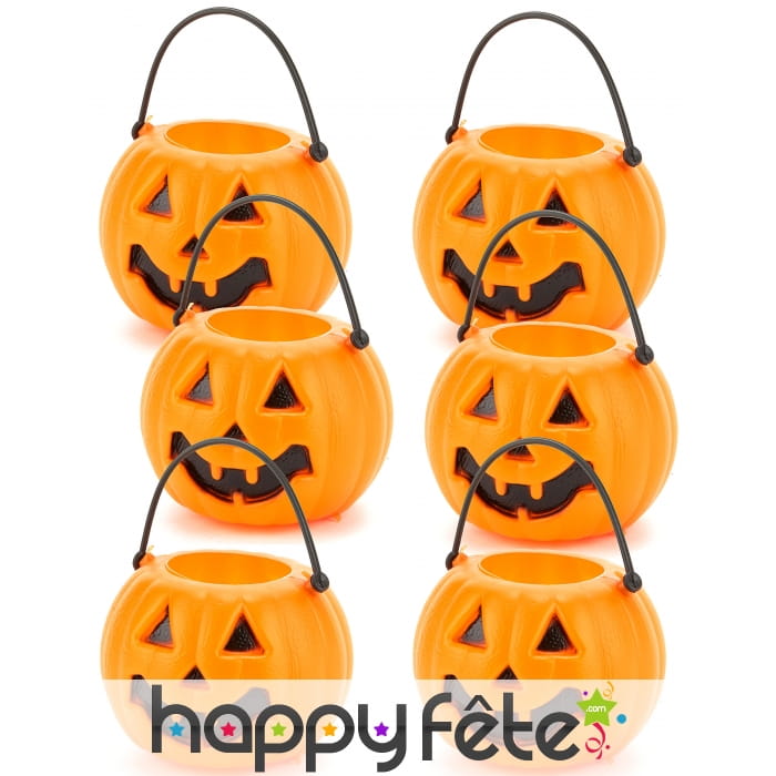 Il s'agit d'un lot de six petits sceaux orange en formes de citrouilles avec des ouvertures sur le haut.