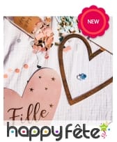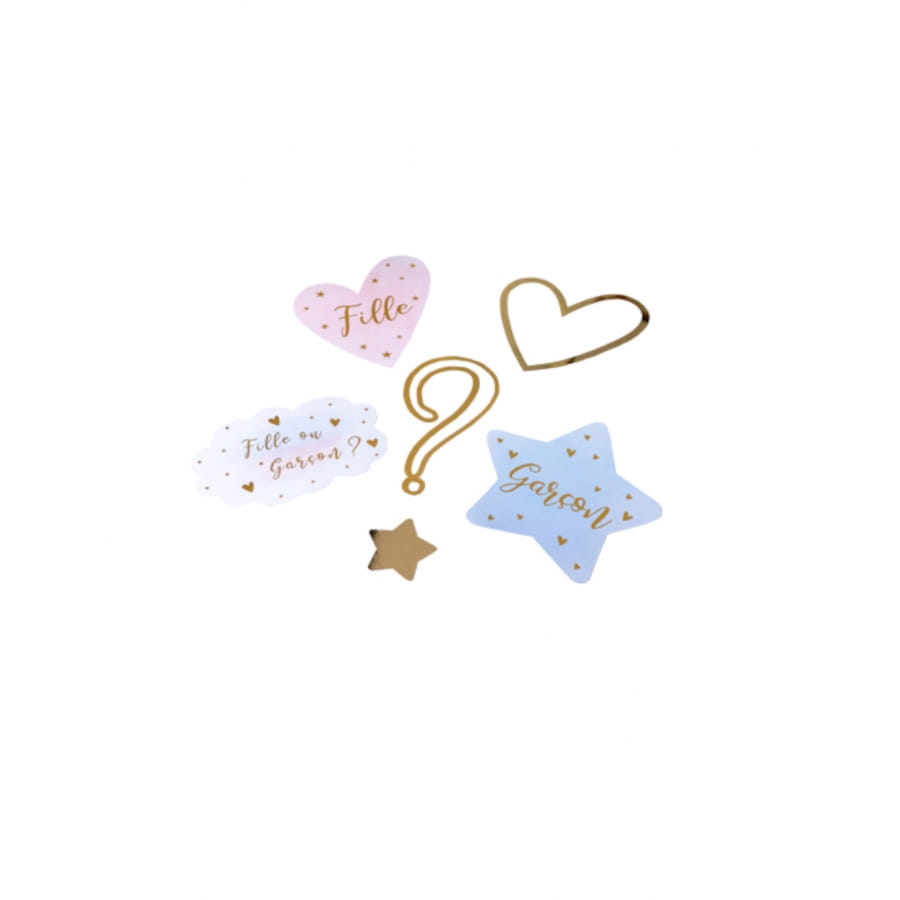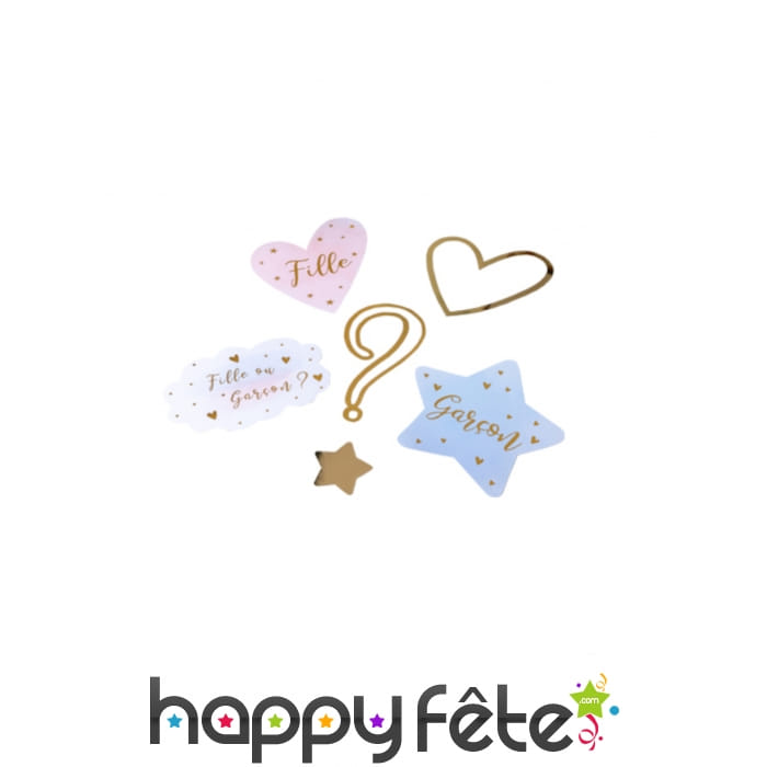 Trois de ces vignettes se présentent sous la forme d'un coeur rose portant le mot Fille, d'une étoile bleue sur laquelle est inscrit le mot Garçon et d'un nuage blanc avec l'expression Fille ou Garçon marquée dessus.