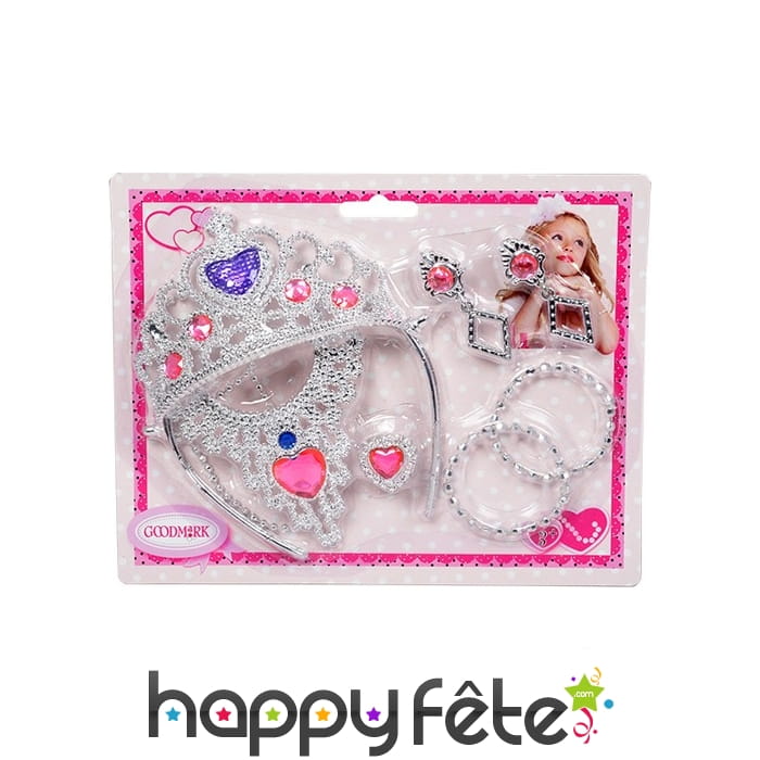 Votre jeune demoiselle sera aux anges en découvrant ses nouveaux petits trésors : une paire de boucles d'oreilles à clips, un diadème, 2 bracelets, une bague, un collier.