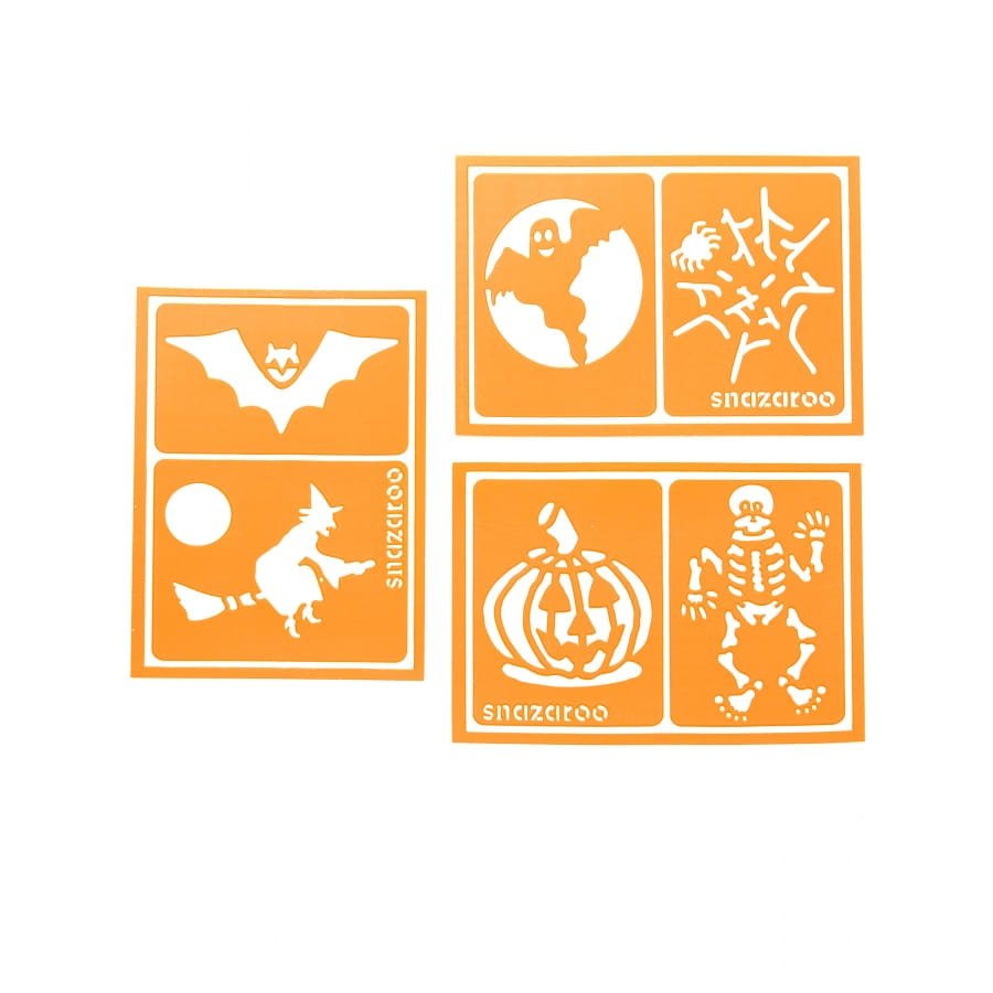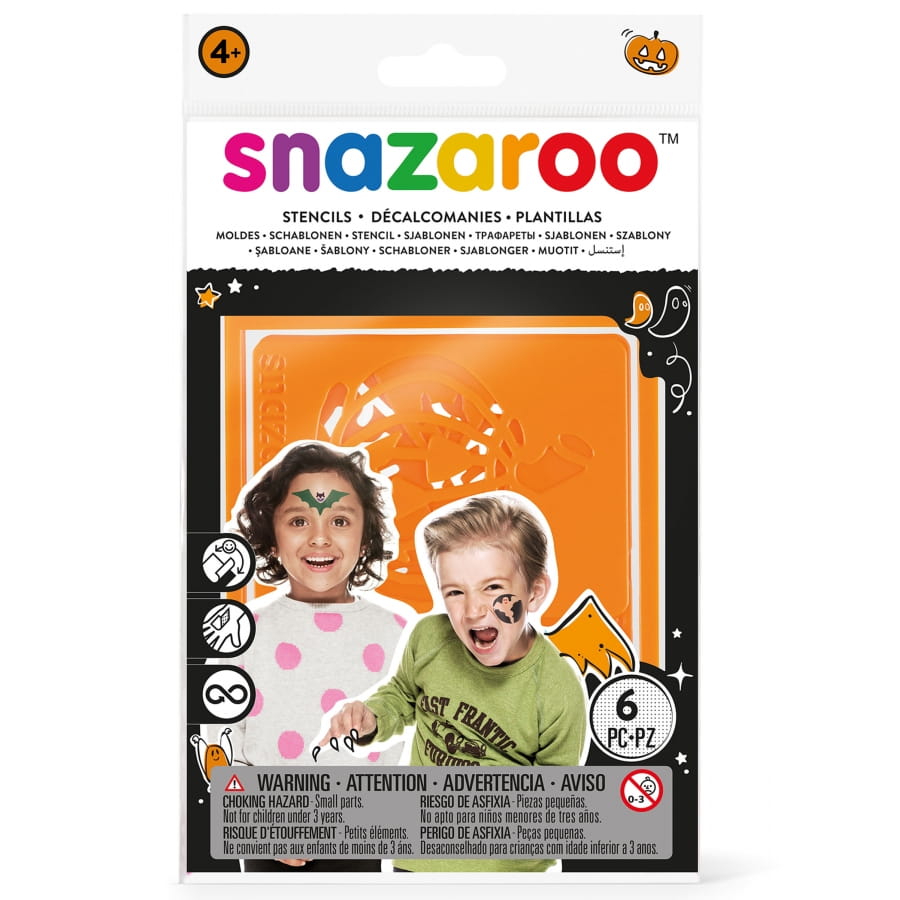 Ces 6 Pochoirs mixtes Halloween, Snazaroo représentant plusieurs personnages effrayant tels qu'une chauve-souris, un fantôme, une toile d'araignée, une citrouille ou encore un squelette, seront parfaits pour maquiller votre peau sans danger lors de vos différentes fêtes à thème.