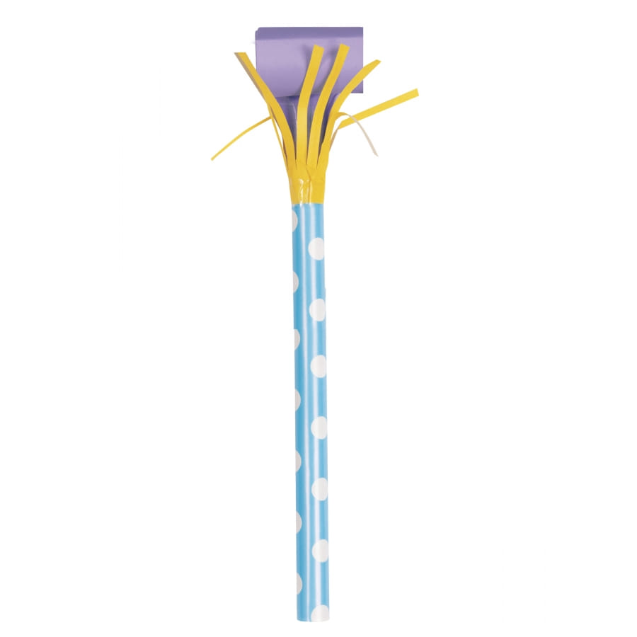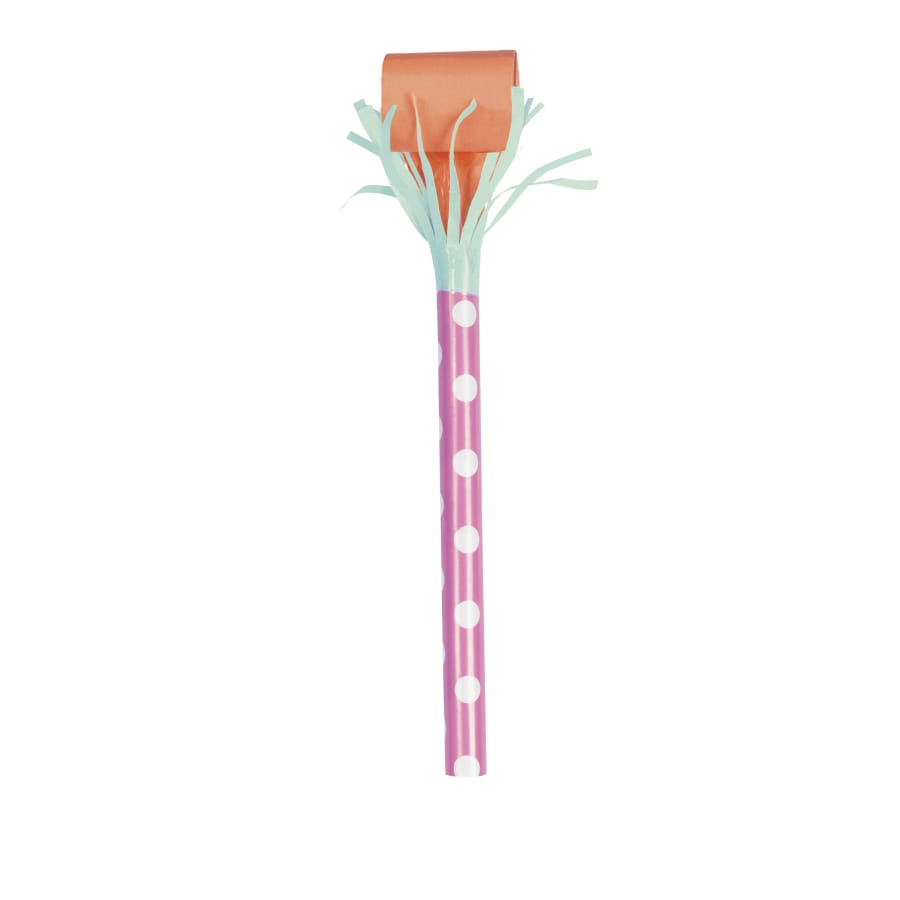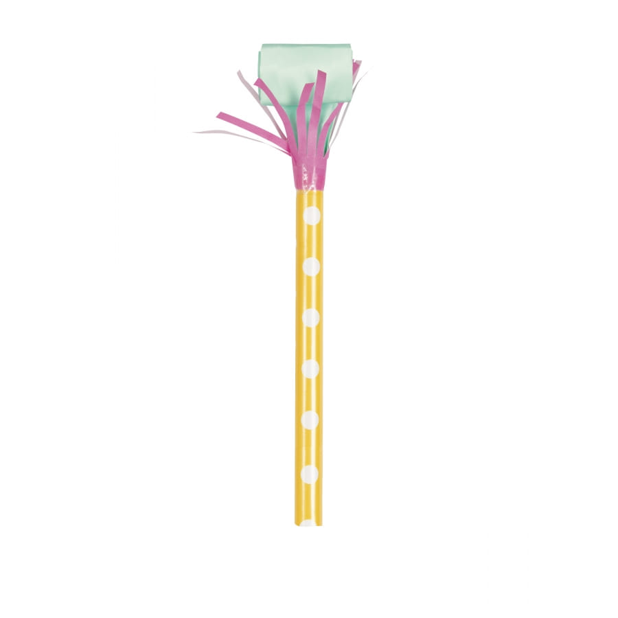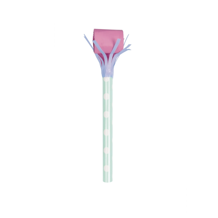 Ces accessoires festifs possèdent des franges colorées, qui agrémentent la base de la languette enroulée.