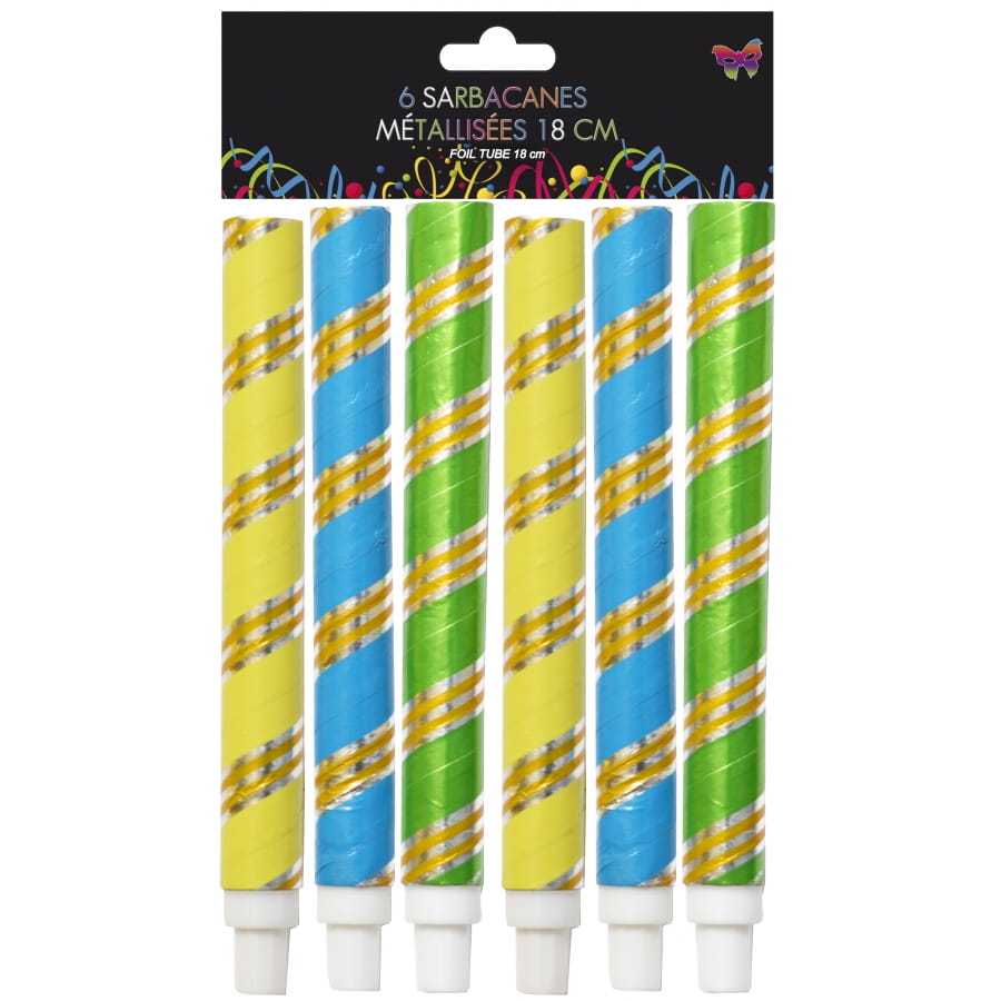 Proposez à vos invités ces sarbacanes aux couleurs assorties métallisées afin d'égayer davantage votre fête. Vendues par lot de 6, elles mesurent chacune 18 centimètres de long avec embout de sécurité inclut. Il vous sera impossible de choisir ni le modèle ni la couleur lors de la commande. Vous recevrez donc le sachet comme présenté.