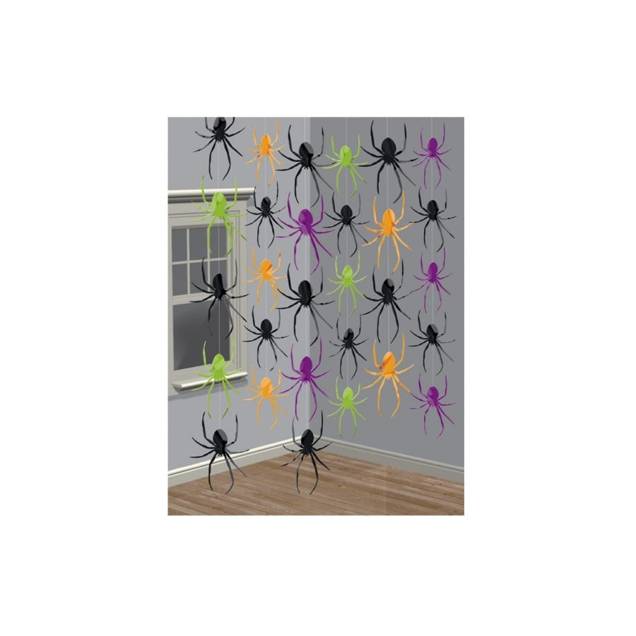 Marrez-vous et créez de la frayeur chez vos invités en décorant votre maison avec ces 6 suspensions araignées colorées de 210 cm à l'occasion d'Halloween.