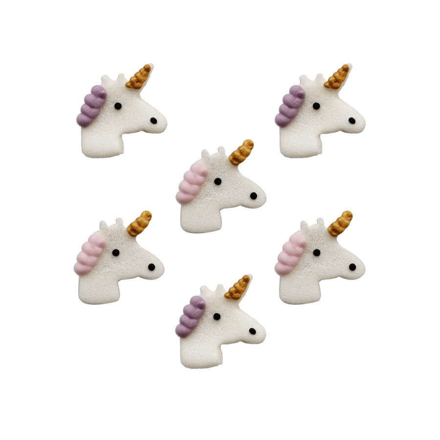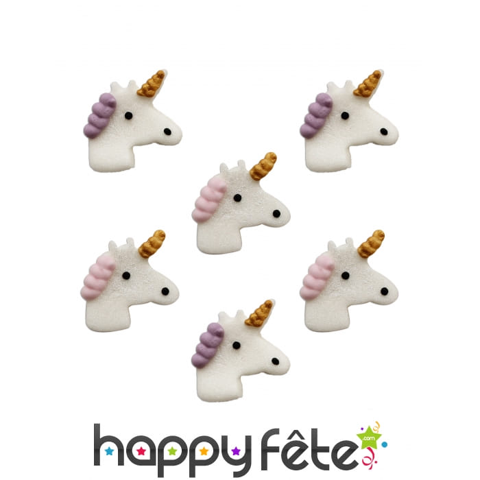 Pour votre prochaine soirée à thème, animez vos pâtisseries grâce aux 6 têtes de licorne en sucre pour gâteau.