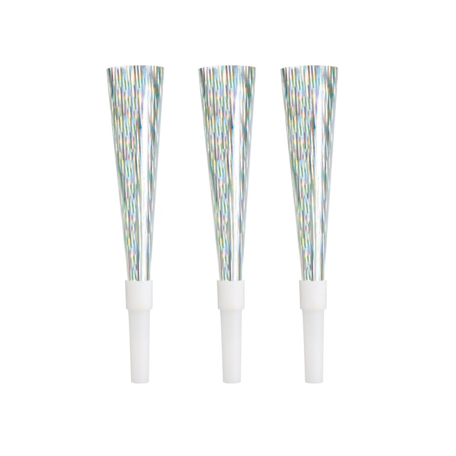 Les 6 trompettes cotillon argentées irisées sont fixés sur une base en plastique.