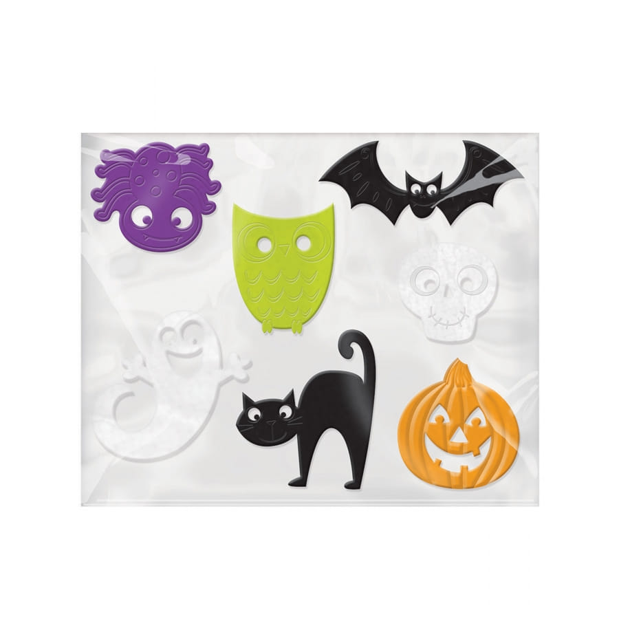Une citrouille souriante orange, un drôle de crâne blanc, un chat noir en même temps hérissé de colère et heureux, une chauve-souris noire, une araignée aux yeux sympathiques, une chouette verte et un fantôme rigolo.