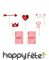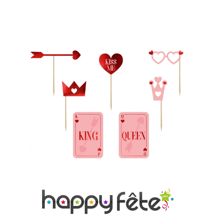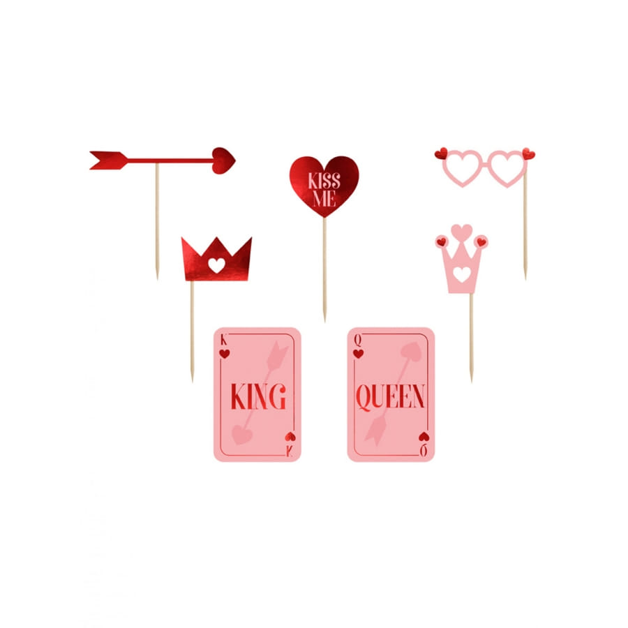 Dans le lot vous trouverez 7 accessoires photobooth parmi lesquels: des lunettes aux cercles rose en forme de coeur, 2 couronnes de roi et reine rose et rouge, 1 flèche avec un coeur rouge à son extrémité, 1 coeur rouge imprimé "Kiss me" ainsi que 2 cartes "King" et "Queen" roses.