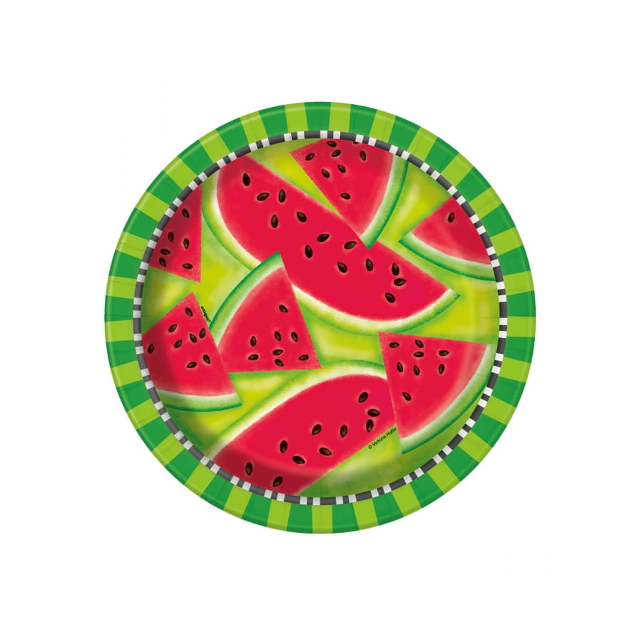 Chaque assiette est faite en carton circulaire sur lequel sont imprimées des tranches de pastèque sur un fond vert.