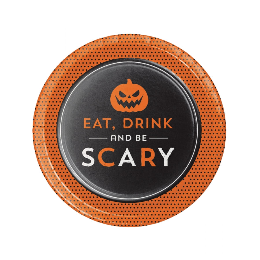 Notre lot de 8 Assiettes Eat Drink and Be scary de 18cm dispose de tous les ingrédients pour une déco d'Halloween réussie.