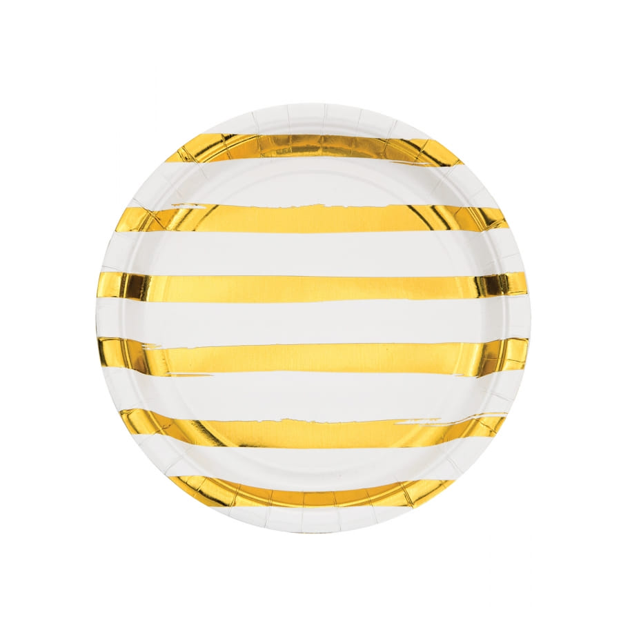 Les assiettes présentent des rayures horizontales de couleur blanche et dorée, ce qui leur donne un effet brillant et gai.