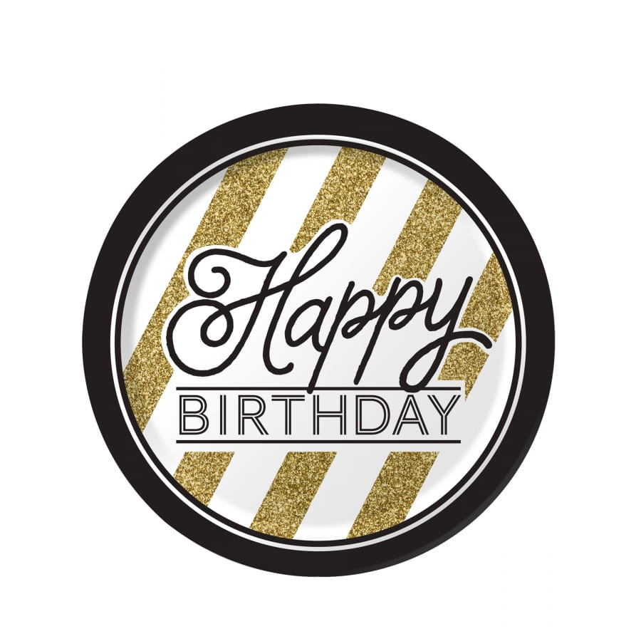 Organisez un anniversaire VIP qui fait la part belle au chic et à la l'élégance grâce à nos 8 assiettes Happy Birthday noir et doré.