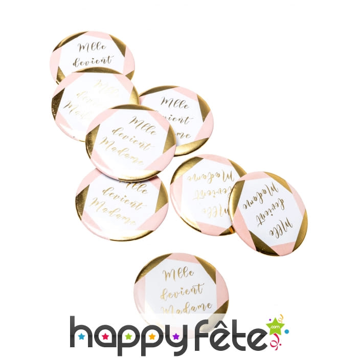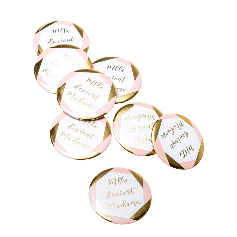 L'équipe de la mariée fera des ravages avec les 8 badges Mlle devient Madame de 5 cm, evjf.
