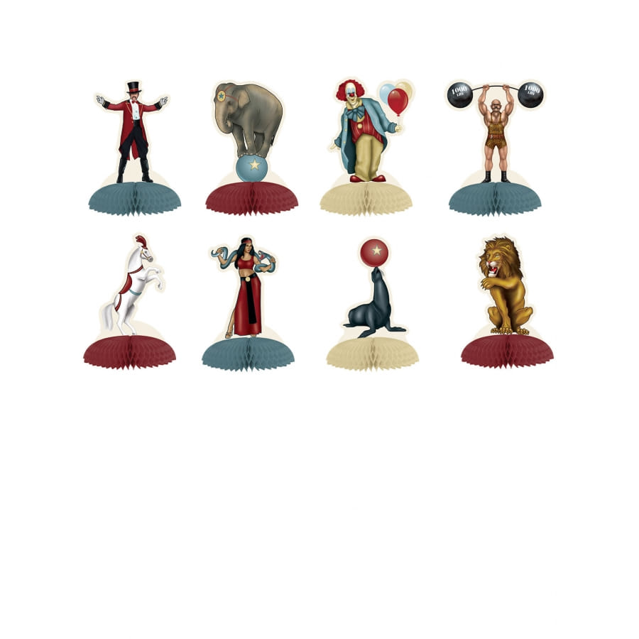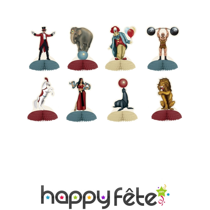 Ces décors de table cartonnés représentent différents personnages et animaux de l'univers du cirque.