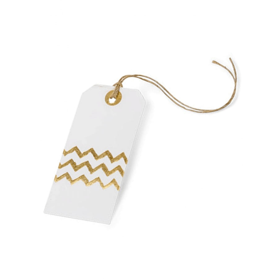 Ce pack de 8 étiquettes blanches imprimé chevron doré est fait d'éléments en carton mesurant environ 8 cm de long pour 4 cm de large.