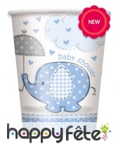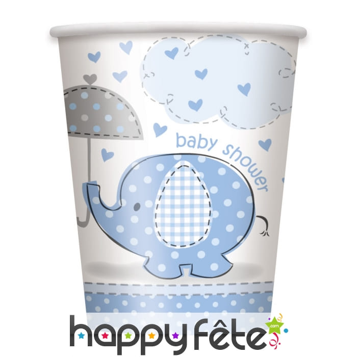Ce sont de jolis gobelets d'une contenant de 25 cl chacun, vendus par lot de 8. Ces gobelets sont fabriqués à base de carton et portent l'image d'un mignon petit éléphant bleu utilisant un parapluie pour se protéger d'une pluie de papillons bleus. On peut lire l'inscription "baby shower" au-dessus de l'éléphant.