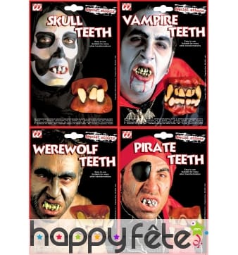 Comment se fait-il que contrairement aux hommes, les vampires aient une dentition particulière ? Est-ce parce que ce sont des suceurs de sang insatiables, ou est-ce dû à leur mode de vie nocturne ? La réponse ne sera sûrement jamais à votre portée, mais les dents, elles, le seront ! Vous avez à votre totale disposition des fausses dents bien crochues, qui ne désirent qu'à être portées. Elles ne sont pas juste réservées aux grands, il existe aussi des vampires enfants ! Alors, préférez-vous les dents authentiques ou celles qui relèvent du fantastique ? Certains modèles présentent des dents longues et bien crochues, parfois ensanglantées. D'autres sont de couleur fluo et sont surtout destinées à faire des farces. Même bébé a droit à une tétine dents de vampire, de quoi faire paniquer les grands parents ! Des dents de monstres bien pourries et salement amochées vous attendent également. Pour des effets plus réalistes, du sang liquide et de l'adhésif pour dentier vous sont aussi proposés dans cette partie. En bref, tout un attirail complet est disponible pour vous préparer à vivre une vraie vie de vampire ! Et pour les fausses dents de vampire vendue sans capsules de sang, retrouvez, dans la catégorie cosmétique, le faux sang qui complètera votre dentition.