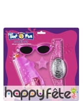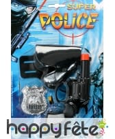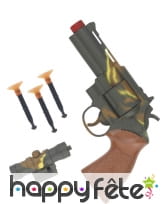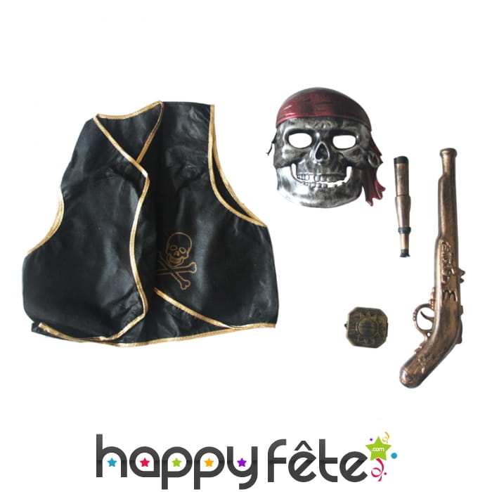 Nous vous proposons cet ensemble d'accessoires de pirate composé d'un masque en plastique gris, d'un gilet noir, d'un compas, d'une longue vue et d'un pistolet marron.