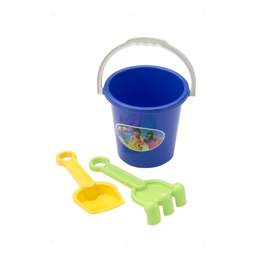 Set de plage, pour enfants, composé d'une pelle jaune, d'un seau bleu et d'un rateau vert. Le tout représente les accessoires basiques pour que votre enfant puisse construire un magnifique château de sable lors d'une journée à la plage.
