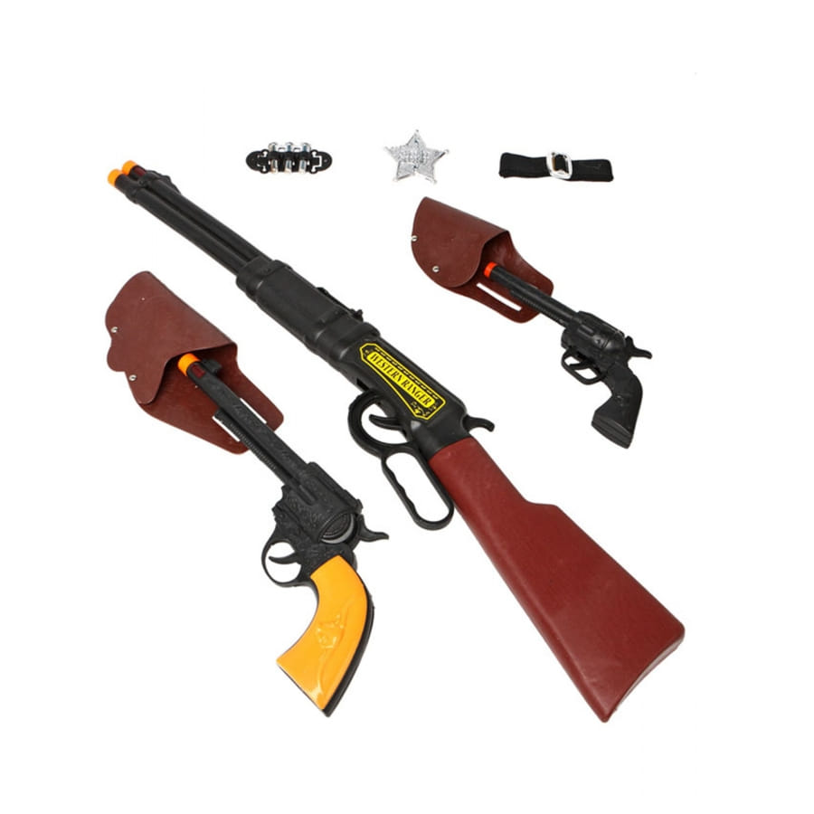 Un insigne de shérif, une ceinture noire avec boucle argentée sur laquelle vous pourrez accrocher les fausses balles argentées.