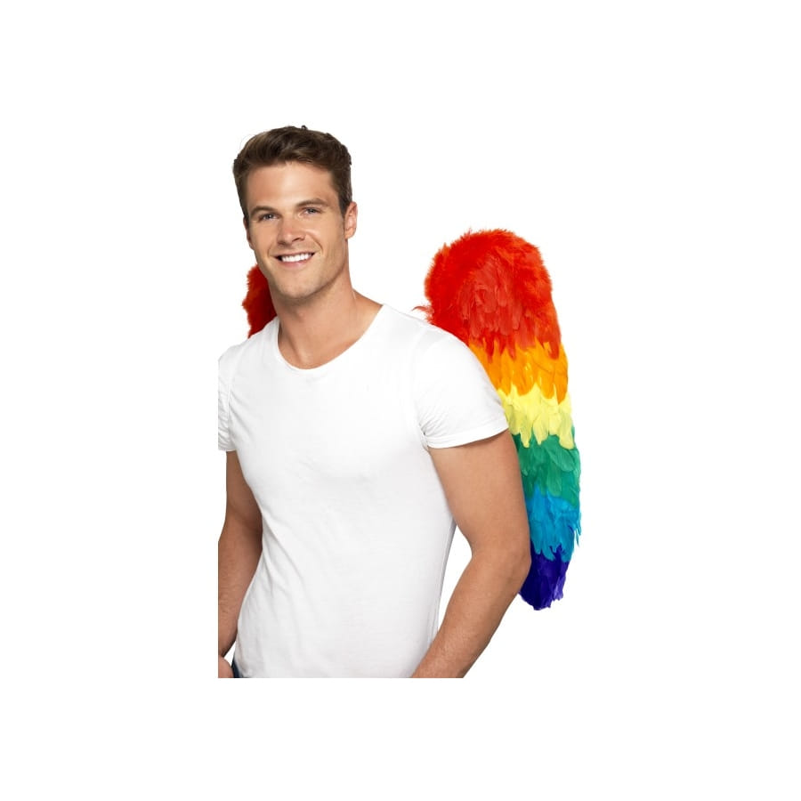 Avec ces ailes ornées de plumes multicolores d'une dimension de 60 cm x 60 cm, vous serez l'ange de la soirée. Elles se fixeront sur votre dos grâce à deux élastiques qui passeront autour de vos bras. Avec ses magnifiques couleurs de l'arc-en-ciel (couleurs de la gay pride et de son célèbre drapeau), elles offriront un effet époustouflant et original à votre costume d'ange, ou d'animaux. Vous pourrez les porter à l'occasion de divers événements festifs et déguisés, tels qu'un carnaval, une soirée conte de fée, une fête exotique, un bal costumé à thème "animaux", etc.