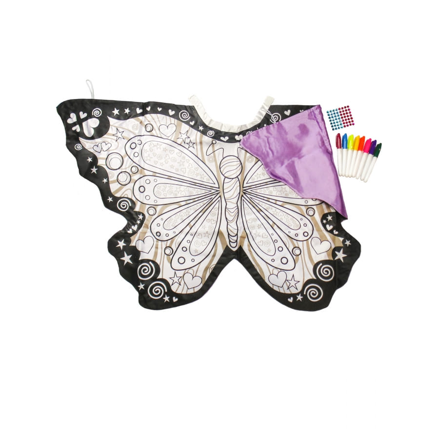Le lot contient une paire d'ailes de papillon dont l'une des faces est en tissu satiné violet, tandis que l'autre présente un imprimé de papillon à colorier.