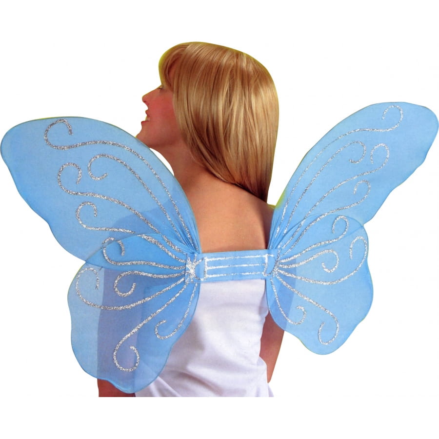Paire d'ailes de papillon bleues avec paillettes pour femme. Les ailes mesurent 50 centimètres de large. les veines des ailes sont dessinées en argenté et rajouter un coté féerique à cet accessoire. Accessoire destiné aux adultes.