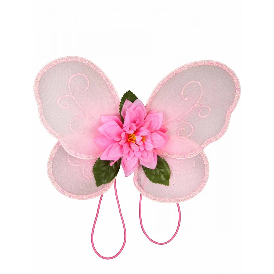 Au centre, une fleur rose est fixée entre les 2 ailes.