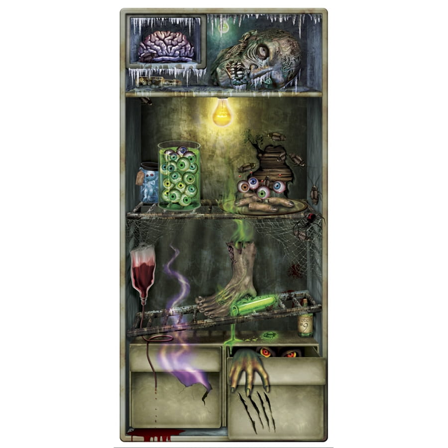 Décor pour réfrigérateur en forme d'aimant multicolore. Cet accessoire mesure 75 centimètres de largeur sur une longueur de 150 centimètres. Recouvrez votre frigo de cet aimant pour une vue plus effrayante, mieux adaptée à Halloween.