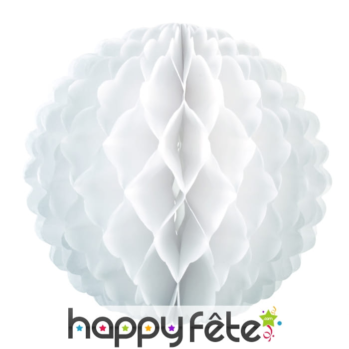 Alvéole en forme de boule de papier de couleur blanche. Cette boule mesure 30 centimètres et sert d'accessoire de décoration idéale pour des occasions telles que la Saint Valentin, un carnaval, la Pâques, un anniversaire ou pour les fêtes de fin d'année.