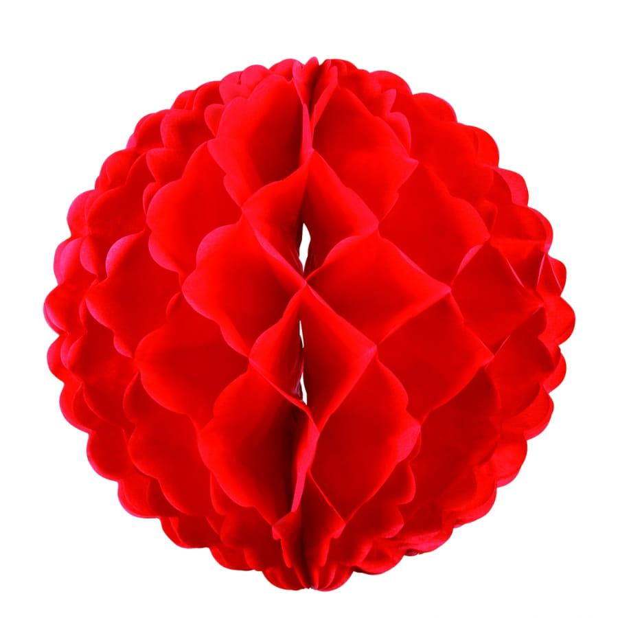 Boule en papier ignifugée en forme d'alvéole. Cet accessoire de décoration de couleur rouge mesure 25 centimètres. Il est parfait pour une décoration de mariage, de carnaval, de Pâques, d'anniversaire ou pour une occasion un peu plus romantique, telle que la Saint Valentin.