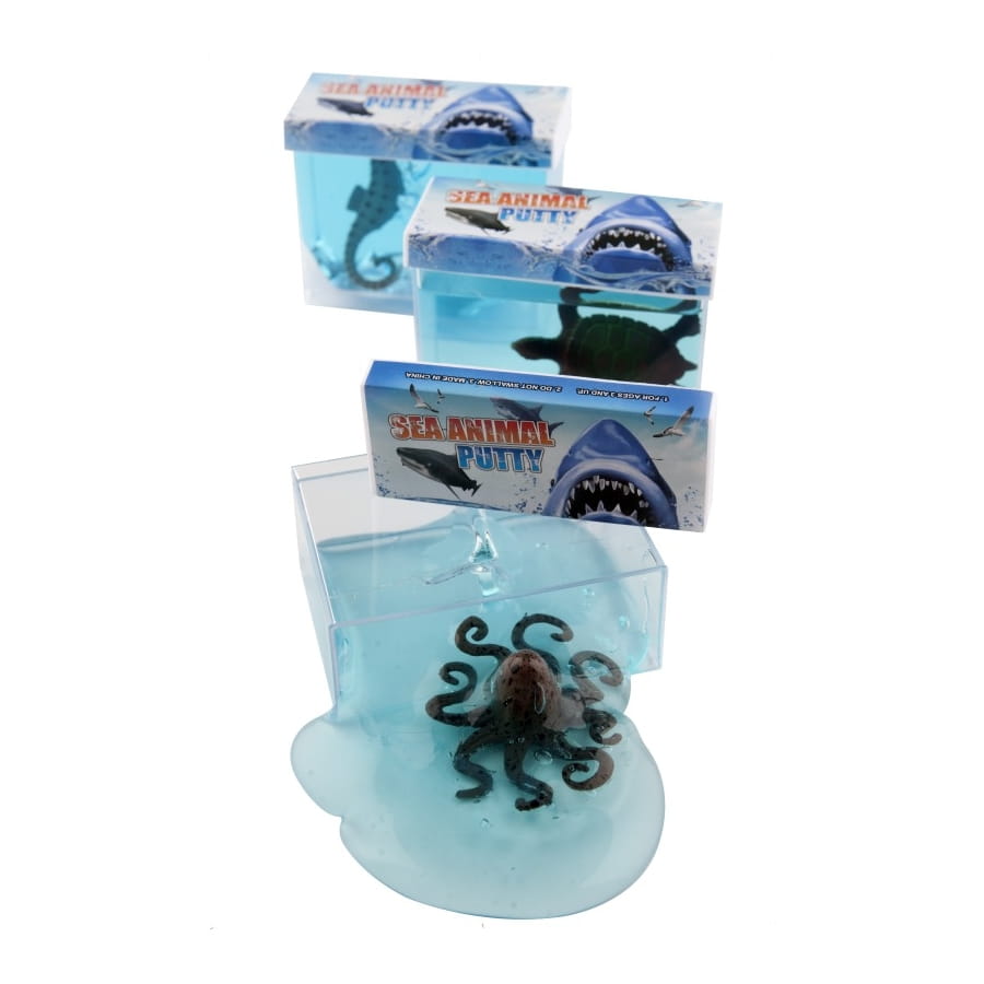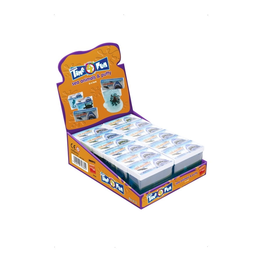 Boîte d'animaux marins renfermés dans des aquarium avec mastic, vendus en lot de 12. Distribuez-les aux amis de vos enfants lors de son anniversaire pour qu'ils puissent tous s'amuser avec.