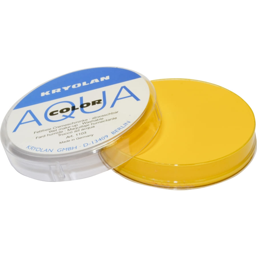 AquaColor de couleur jaune, de la marque de qualité professionnelle Kryolan. Le pot contient 55 millilitres de maquillage à l'eau, très facile à utiliser. Utilisez une éponge ou un pinceau pour faire votre maquillage et de l'eau et du savon pour l'enlever. Utilisez une poudre sèche ou transparente pour tout fixer.